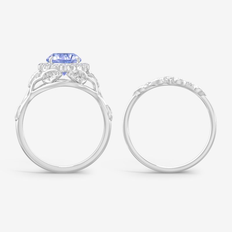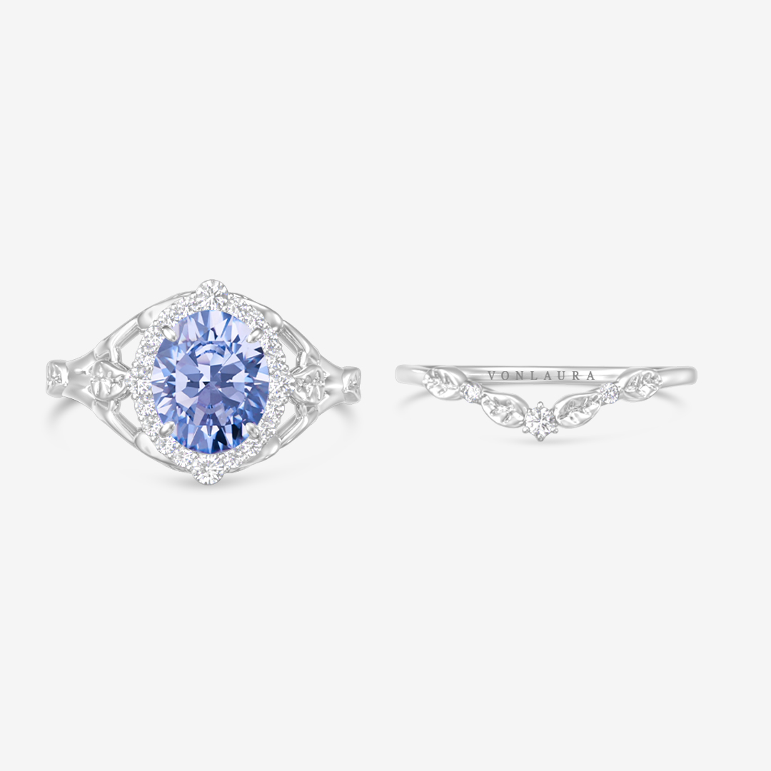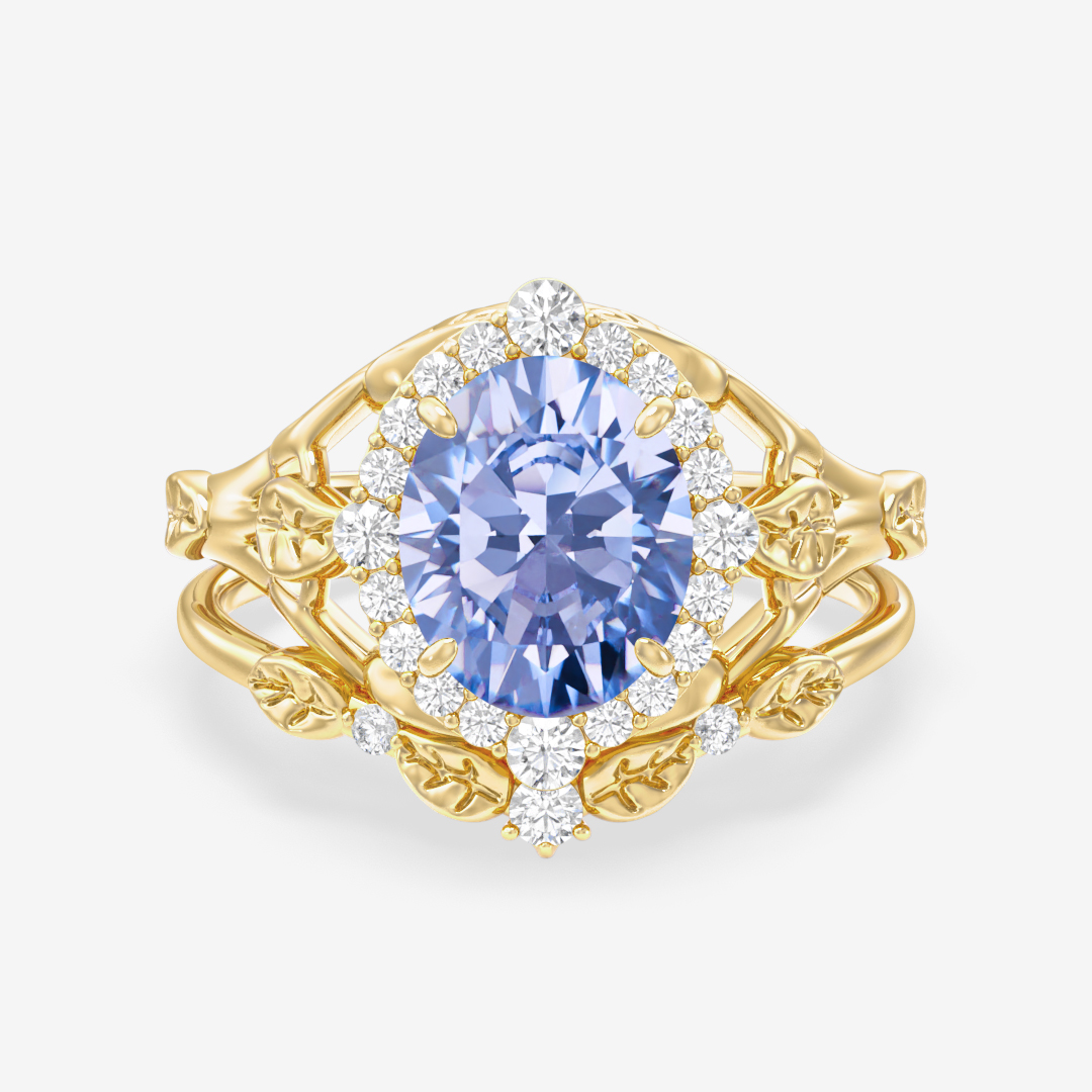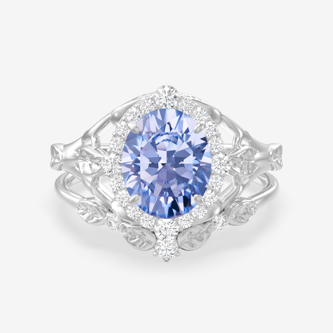 The Alexandra ring set blends timeless elegance with a romantic, heirloom-inspired design. At its center rests an oval-cut sapphire, embraced by a halo of shimmering diamonds that highlight its soft brilliance. The accompanying band completes the set with sculpted details and sparkling accents, creating a harmonious, regal silhouette.