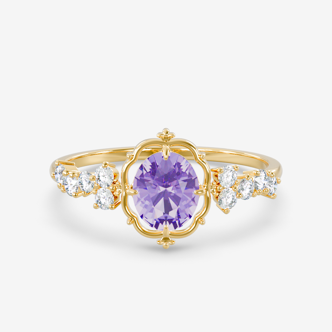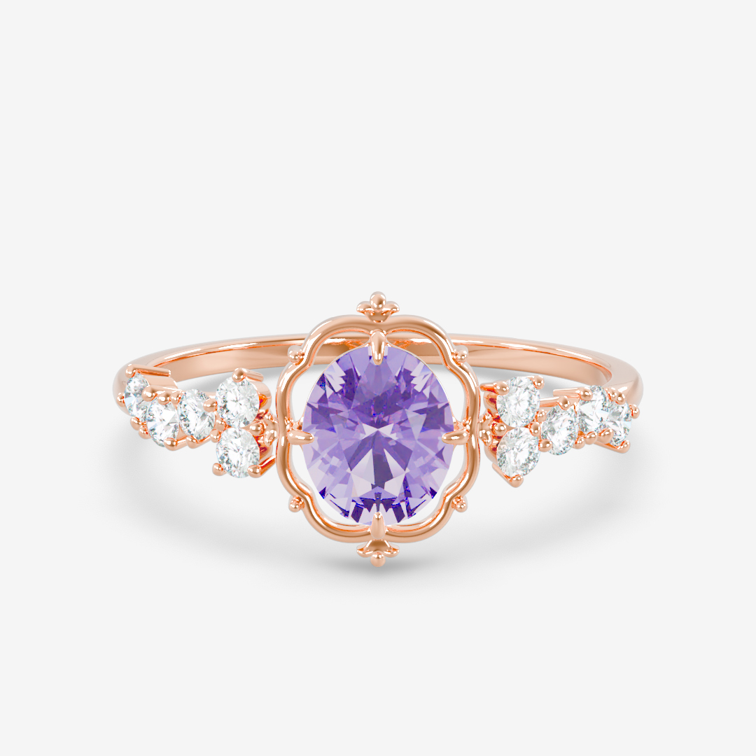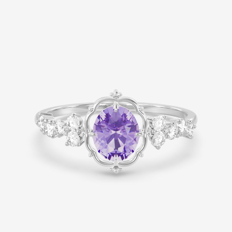 Amara is an engagement ring that unites romance and elegance. The purple center stone radiates within a decorative floral frame, surrounded by shimmering side stones that enhance its brilliance. The design is both feminine and unique β perfect for those who love color, nature-inspired shapes, and jewelry with a personal touch. Amara symbolizes passion, beauty, and a love in full bloom.