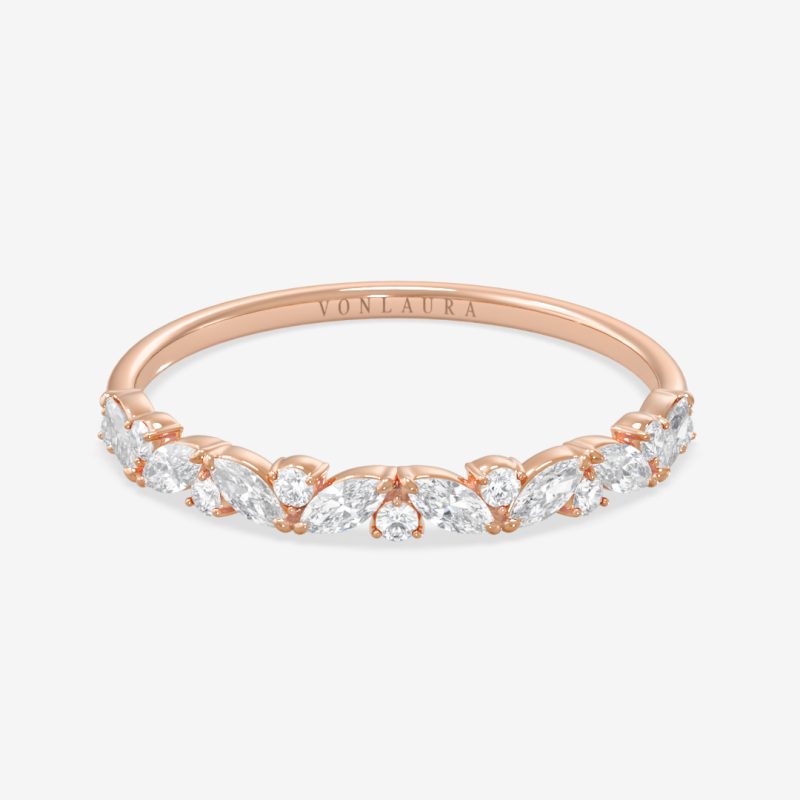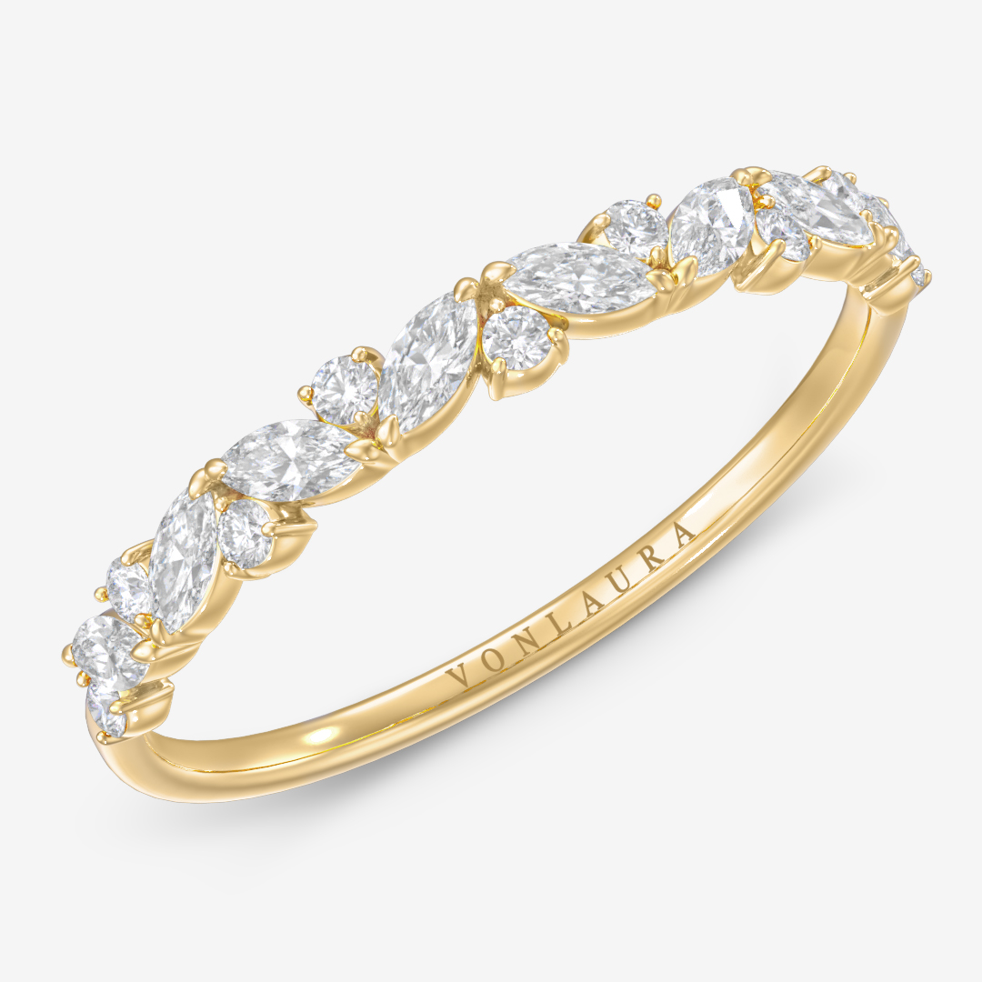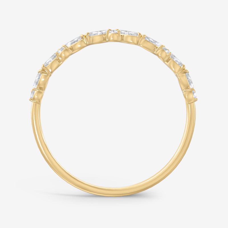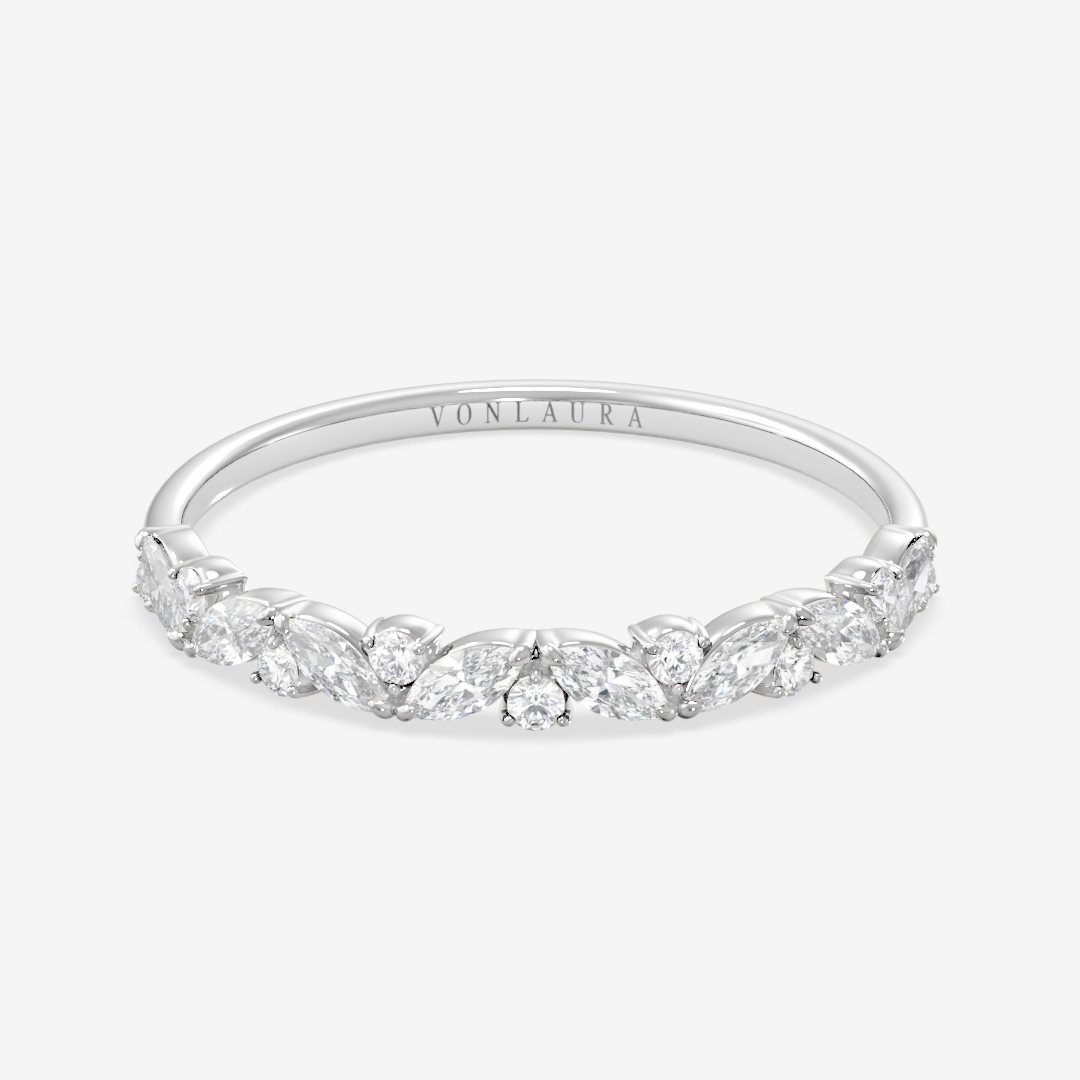 Diana is an elegant wedding band designed for those who appreciate timeless beauty. The marquise and round diamonds are arranged in a softly flowing pattern that gives the ring a sophisticated, sparkling character from every angle. Perfect to wear on its own or paired with an engagement ring – Diana always brings a sense of pure elegance.