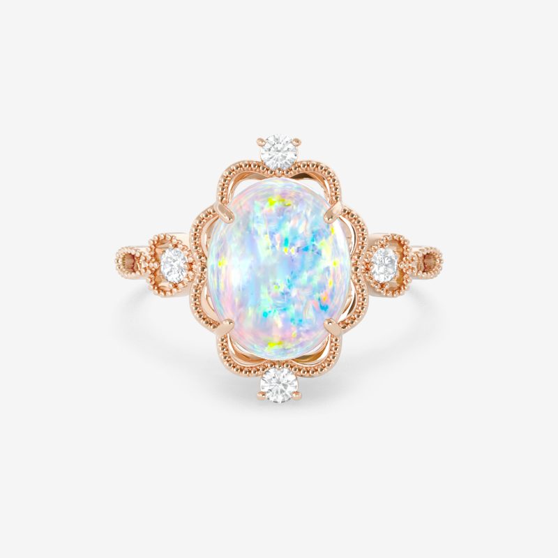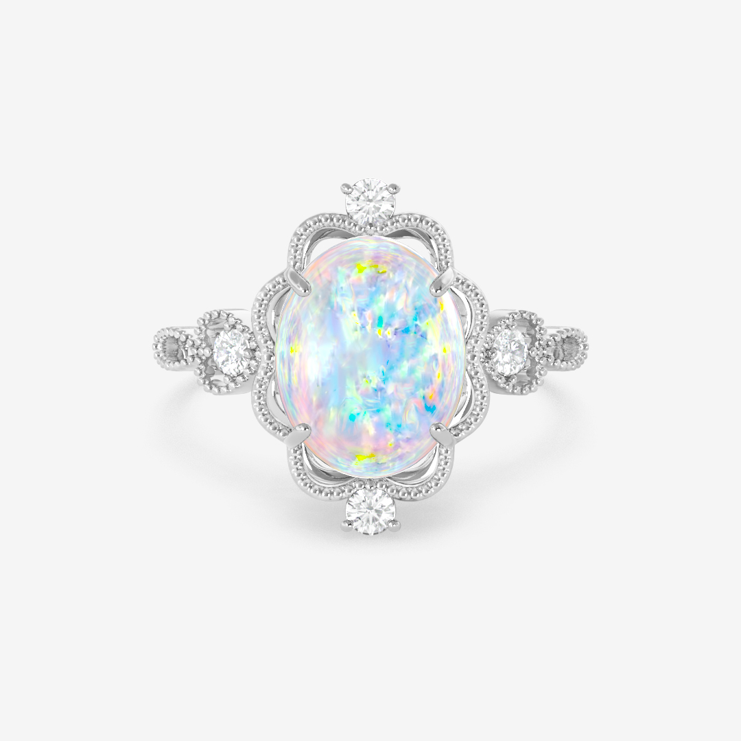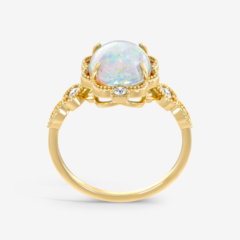 Elara is a ring where light comes alive. At its heart rests a luminous opal, glowing with shifting hues that mirror the ever-changing beauty of the sky. The ornate vintage-inspired setting, adorned with sparkling diamonds, frames the stone like a work of art, enhancing both its mystery and brilliance.