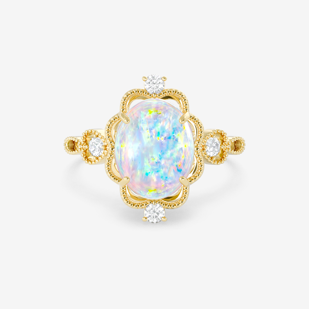 Elara is a ring where light comes alive. At its heart rests a luminous opal, glowing with shifting hues that mirror the ever-changing beauty of the sky. The ornate vintage-inspired setting, adorned with sparkling diamonds, frames the stone like a work of art, enhancing both its mystery and brilliance.