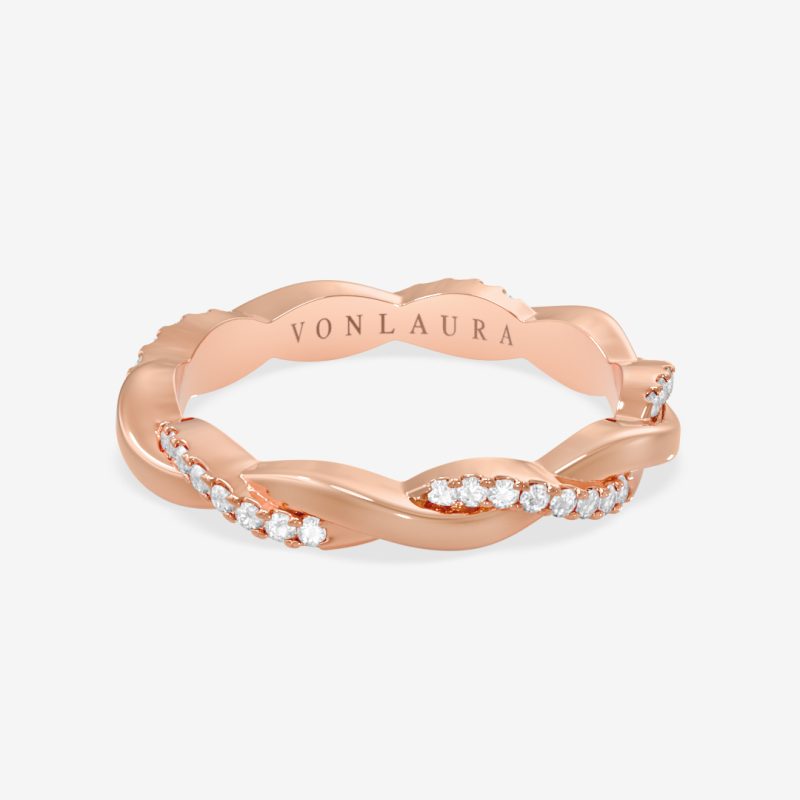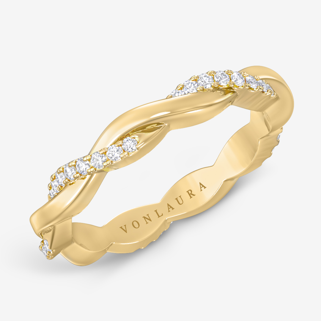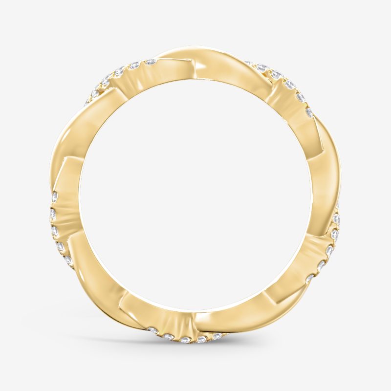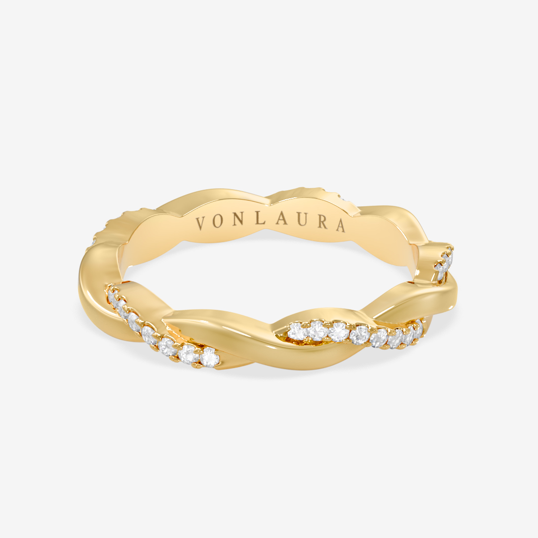 Elowen is a beautifully crafted band with an elegant twisted design, enriched with shimmering round-cut diamonds that follow the flow of the gold. The braided structure gives the ring depth, movement, and a timeless character. Perfect to wear alone or stacked alongside an engagement ring for added sparkle and sophistication.