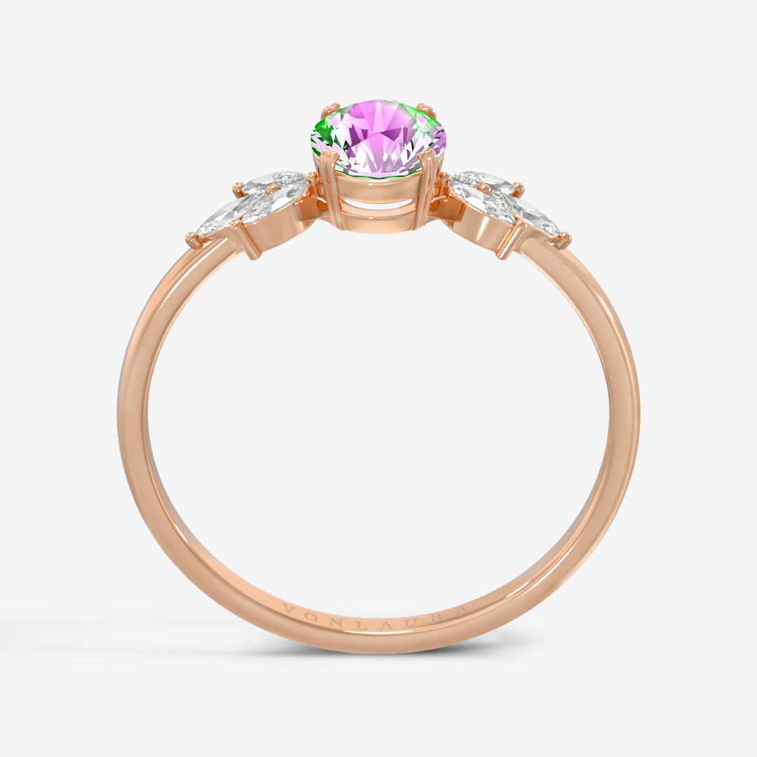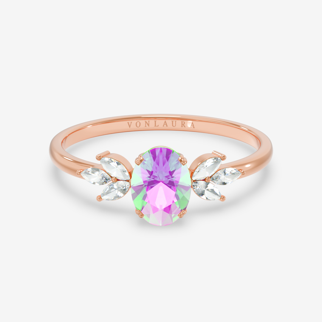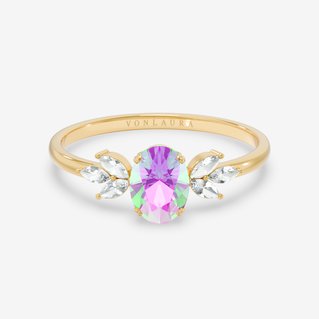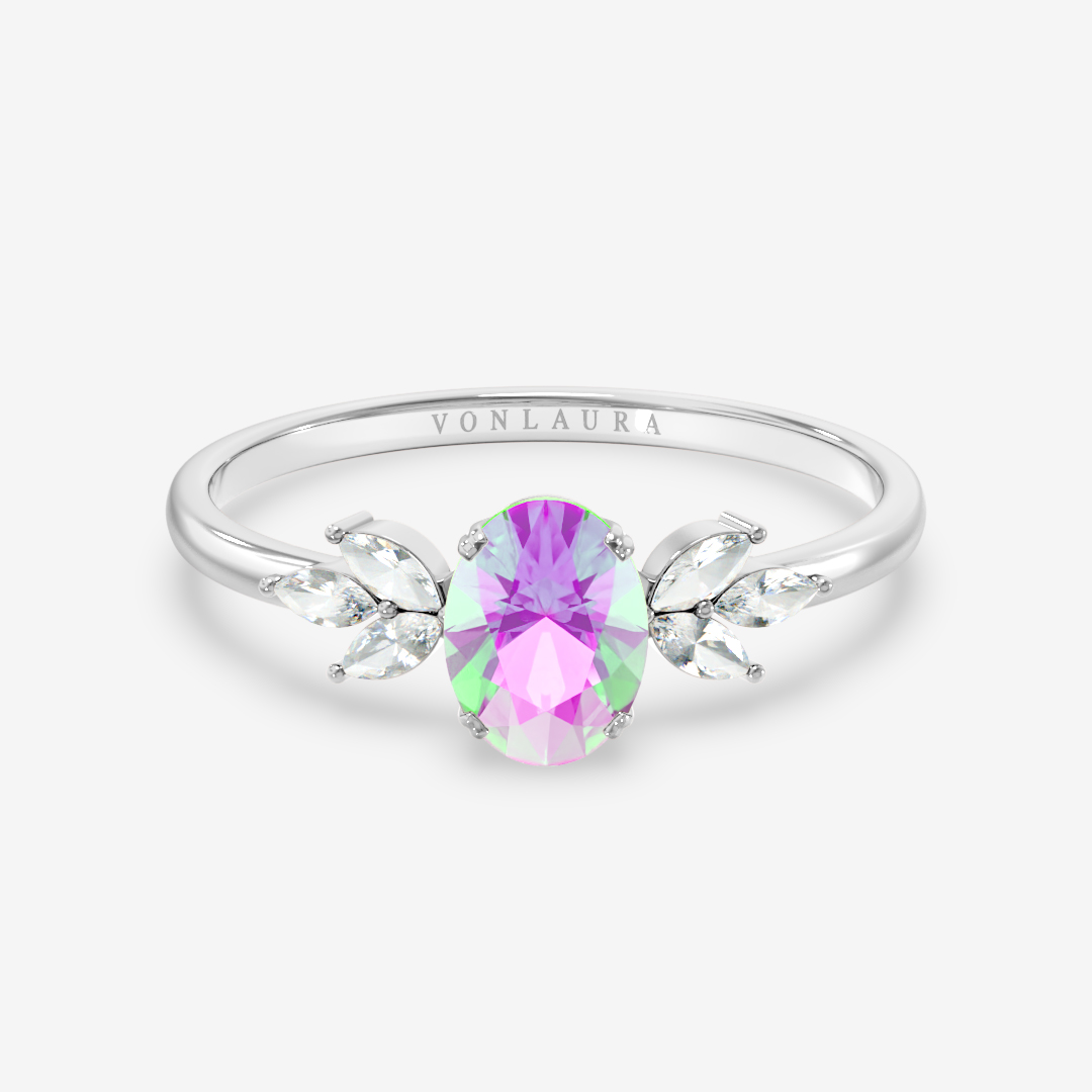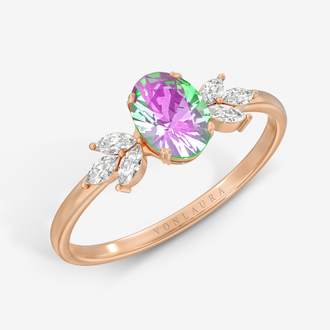 The Victoria engagement ring radiates modern magic wrapped in timeless elegance. Its oval-cut Aurora gemstone shifts in soft hues of violet and green, creating a mesmerizing play of light. Flanked by marquise-cut diamonds that resemble delicate leaves, this ring embodies both romance and individuality. Victoria is made for those who see beauty in color, light, and love that dares to stand out.