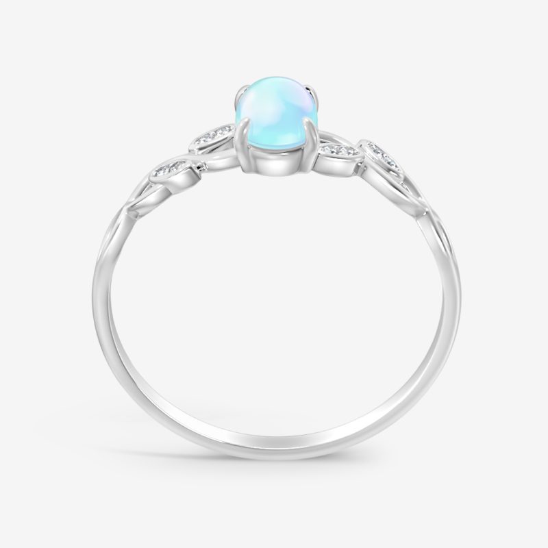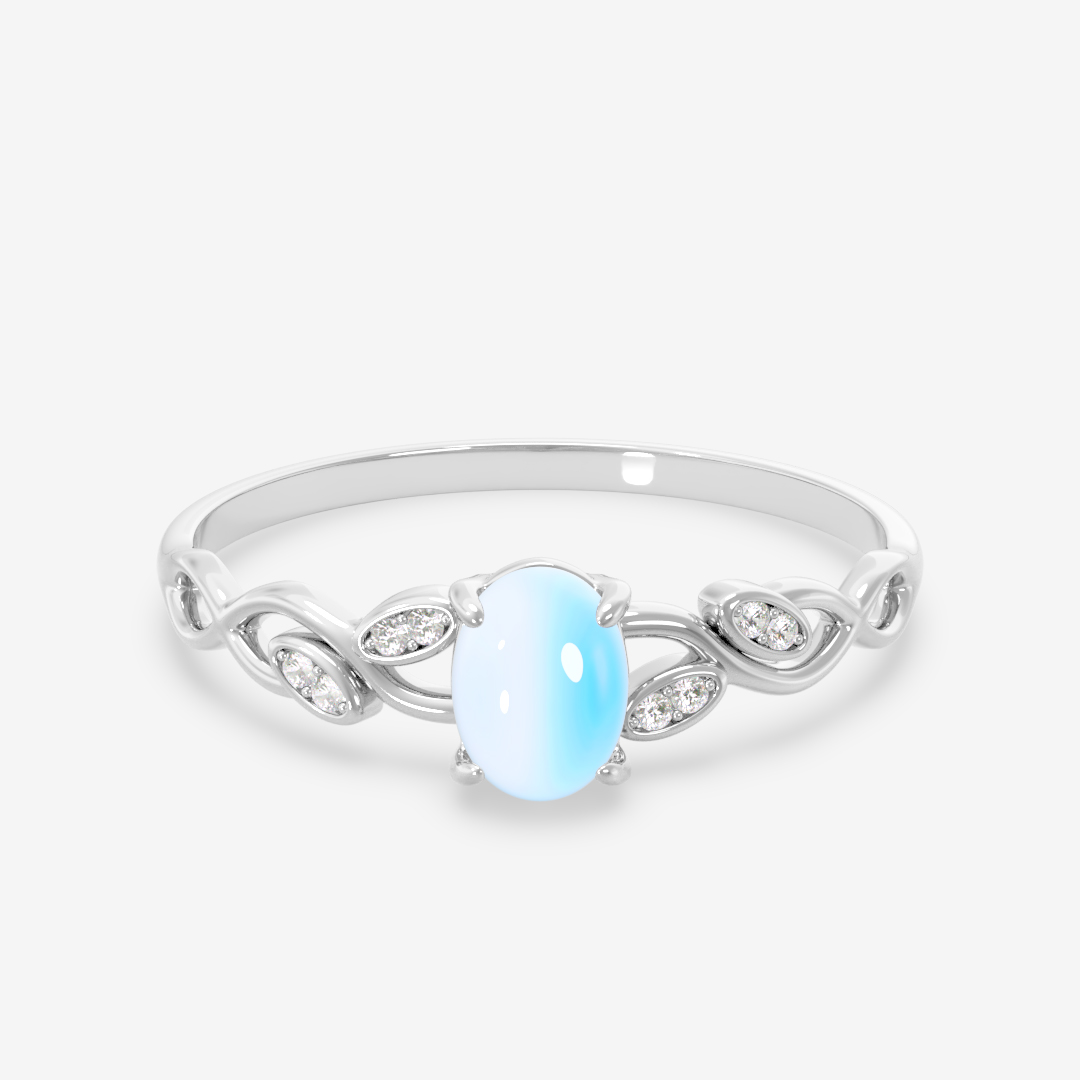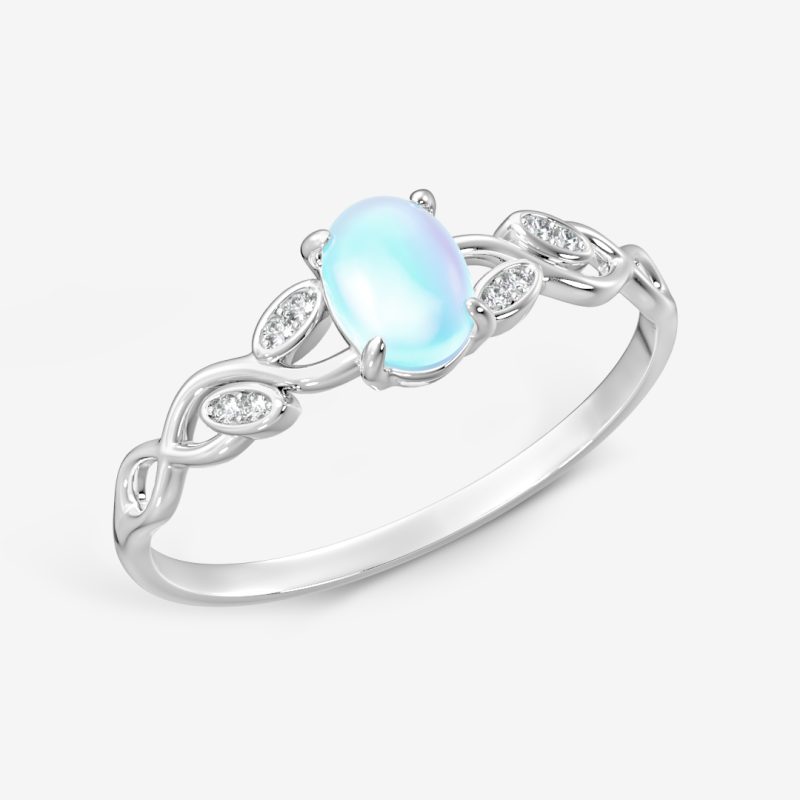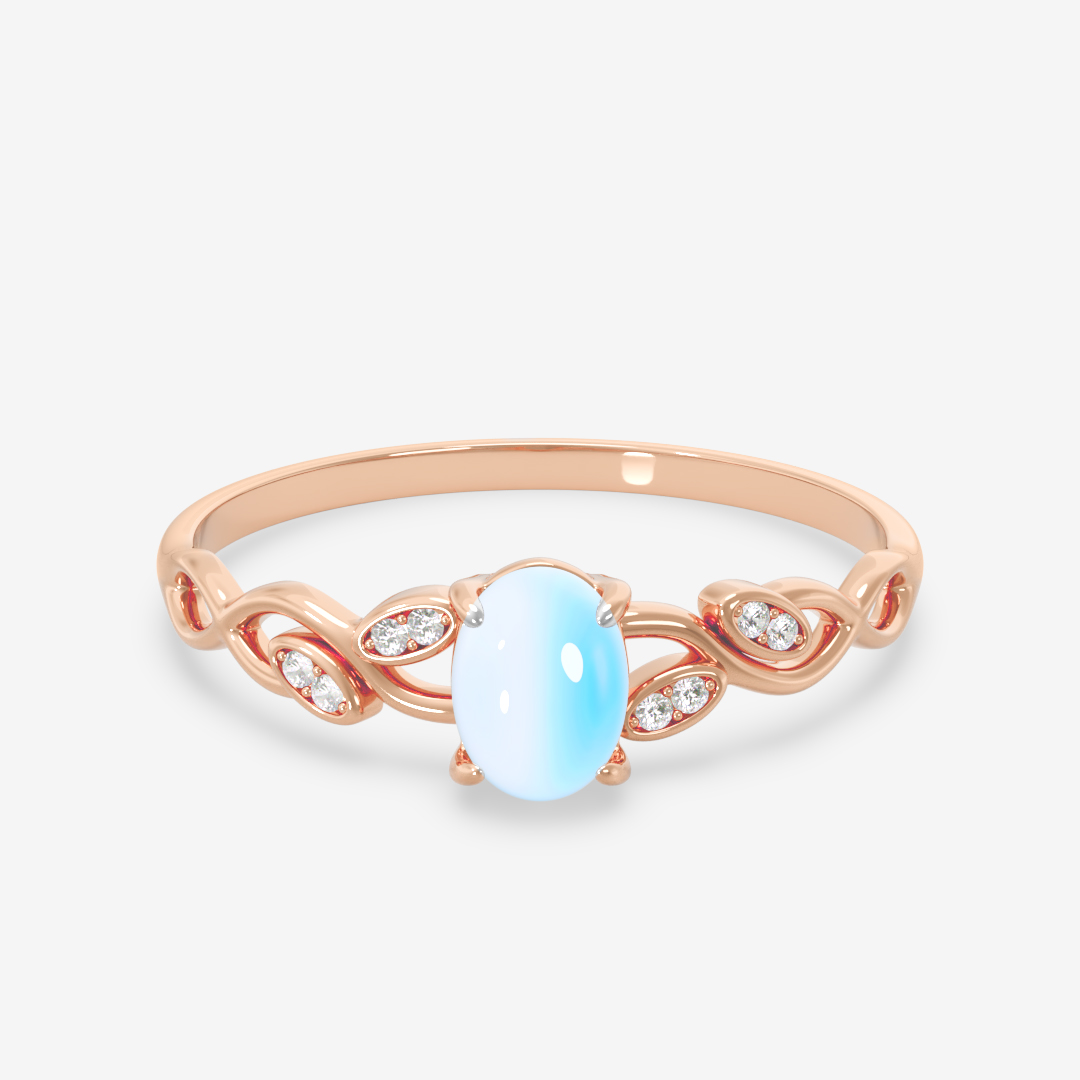 The Grace engagement ring captures the quiet beauty of nature and timeless romance. A soft, glowing moonstone rests at its heart, framed by delicate diamond leaves that shimmer with every movement. The intertwined band adds a poetic touch, symbolizing two lives woven together. Refined yet full of character, Grace is a perfect choice for those drawn to elegance with a hint of the ethereal.