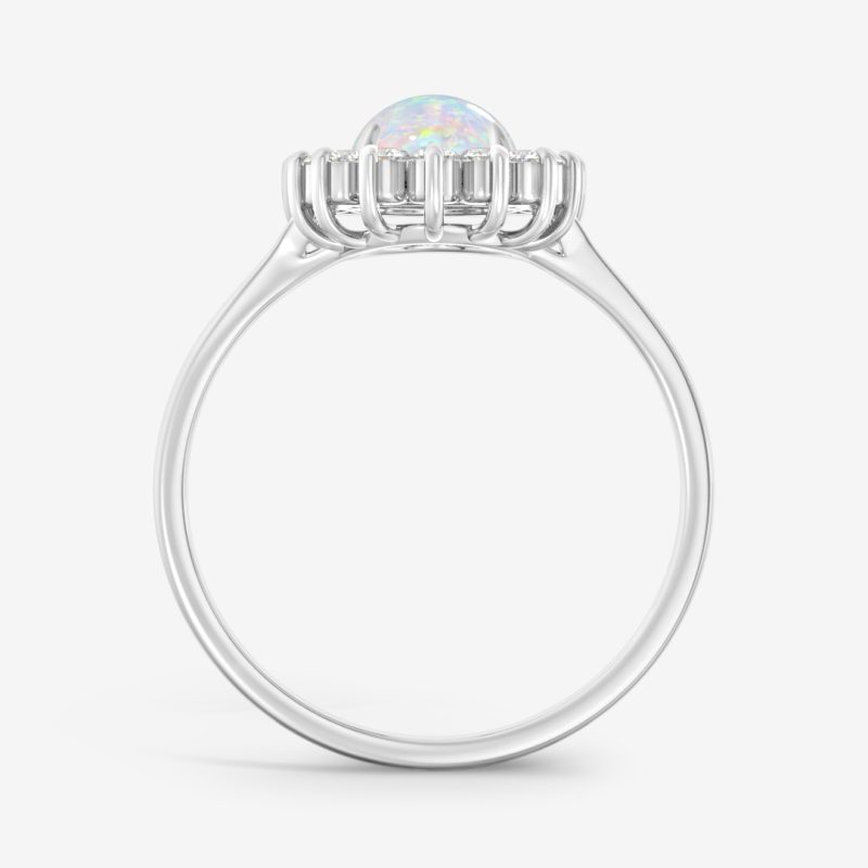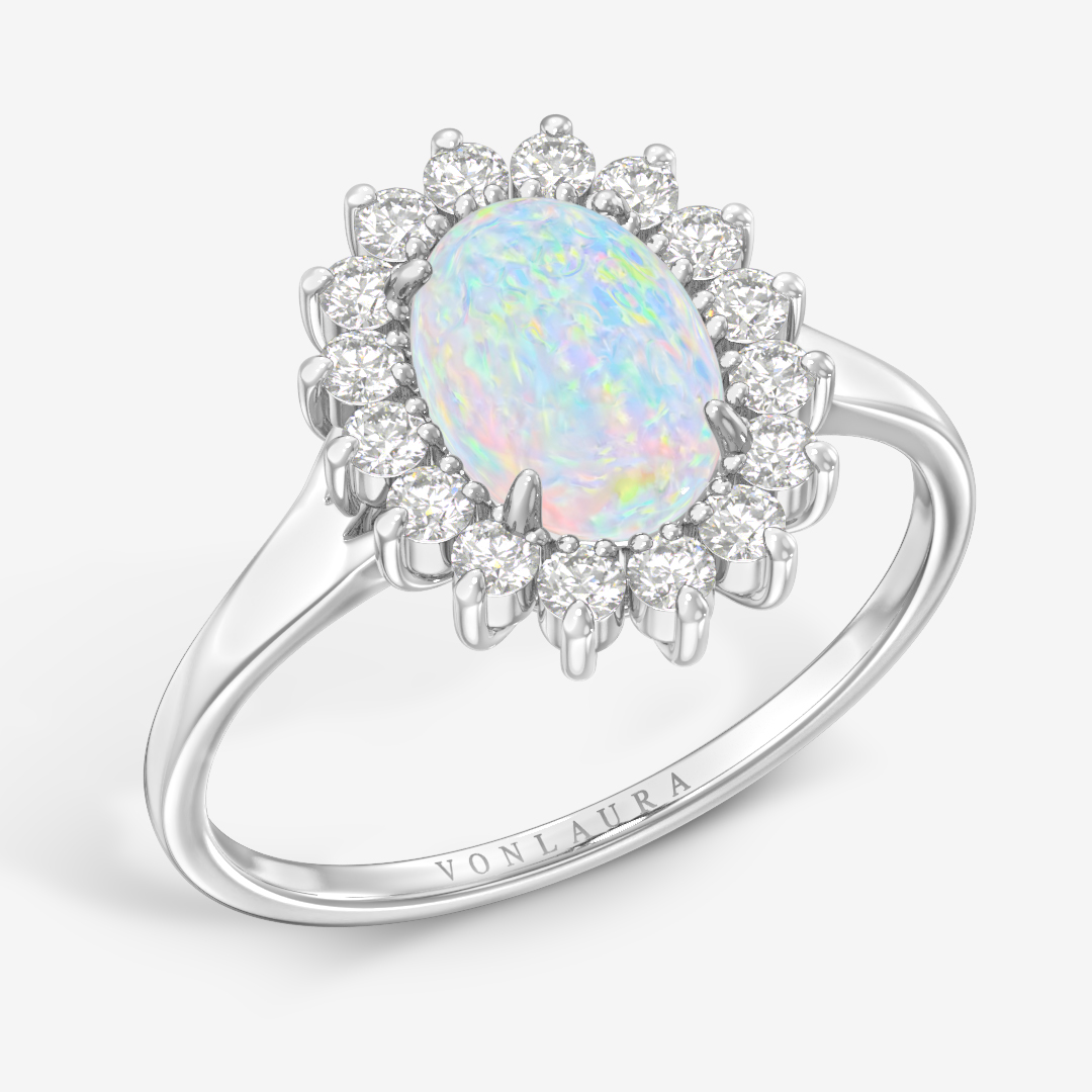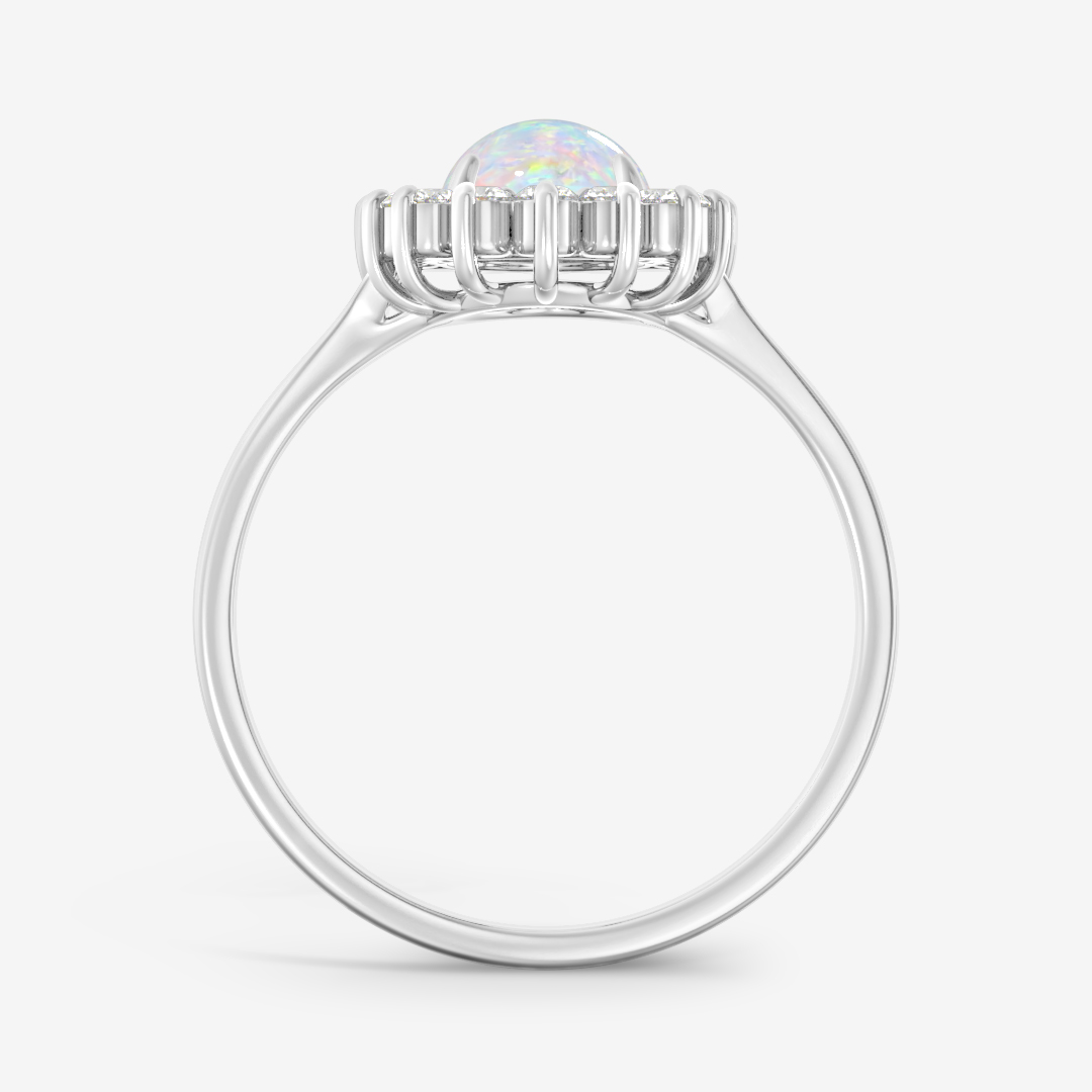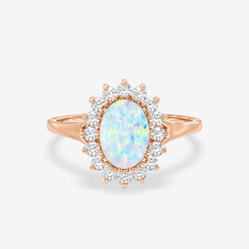 Helen is a timeless halo ring that radiates elegance and warmth. At its center lies a mesmerizing oval-cut opal, glowing with shifting hues of blue and gold, surrounded by a halo of sparkling natural diamonds. The golden setting enhances the opal’s fire, giving the design a vintage yet modern appeal. Perfect for those who appreciate refined beauty and a touch of artistry in their jewelry, Evelyn embodies grace, light, and individuality.