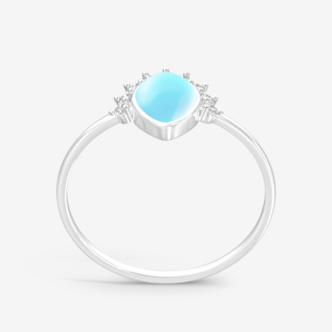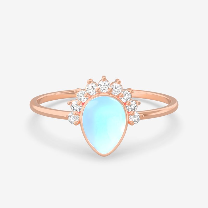Liora is an engagement ring that captures the quiet magic of the night. The pear-shaped moonstone shimmers in soft blue tones, framed by a crown of sparkling side stones reminiscent of stars against a clear sky. Despite its delicate form, the design carries a powerful presence – a symbol of dreams, intuition, and everlasting love.