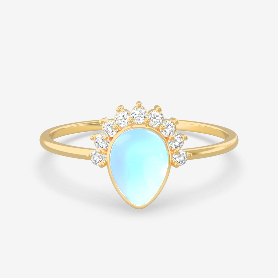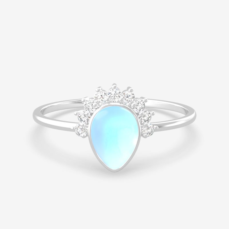 Liora is an engagement ring that captures the quiet magic of the night. The pear-shaped moonstone shimmers in soft blue tones, framed by a crown of sparkling side stones reminiscent of stars against a clear sky. Despite its delicate form, the design carries a powerful presence – a symbol of dreams, intuition, and everlasting love.