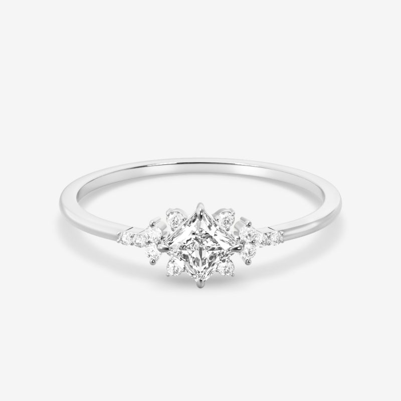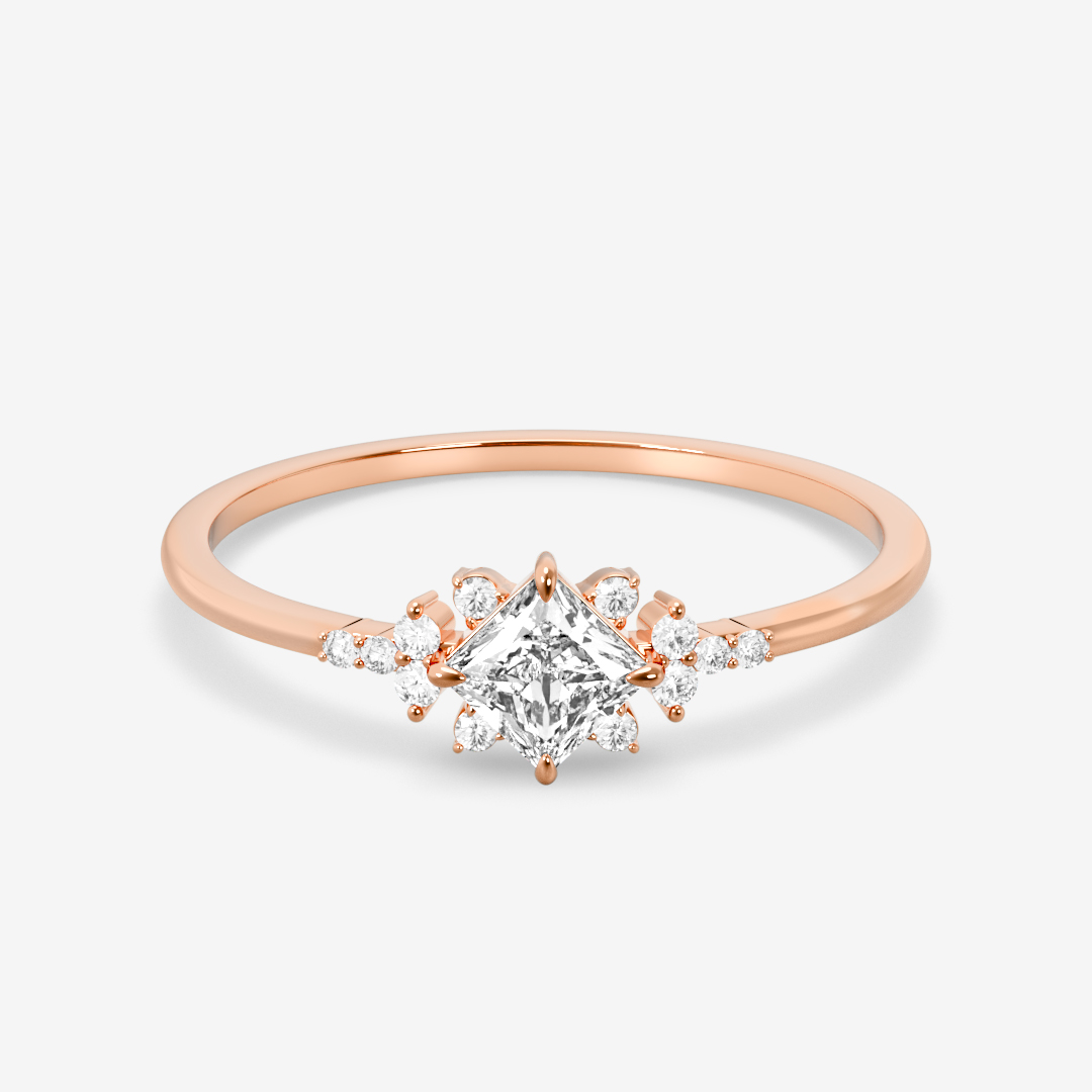 Lyra is a tribute to the power of subtle beauty. The princess-cut center stone shines with its pure geometry, while the surrounding diamond-studded petals create a sense of blossoming lightness. Despite its delicate form, Lyra carries a powerful presence β a jewel that proves greatness is not always measured in size, but in the spark that captures every gaze.