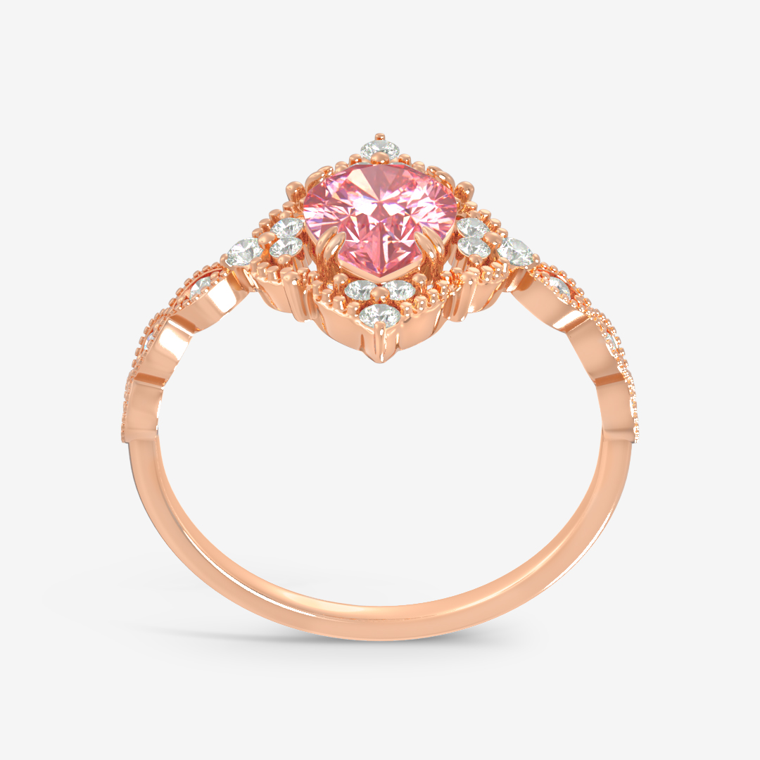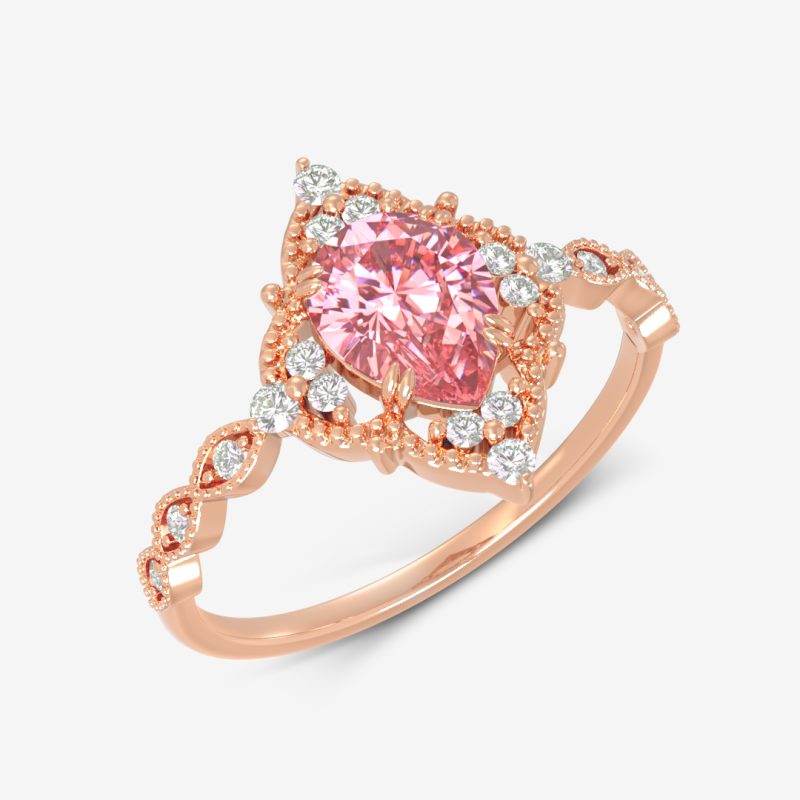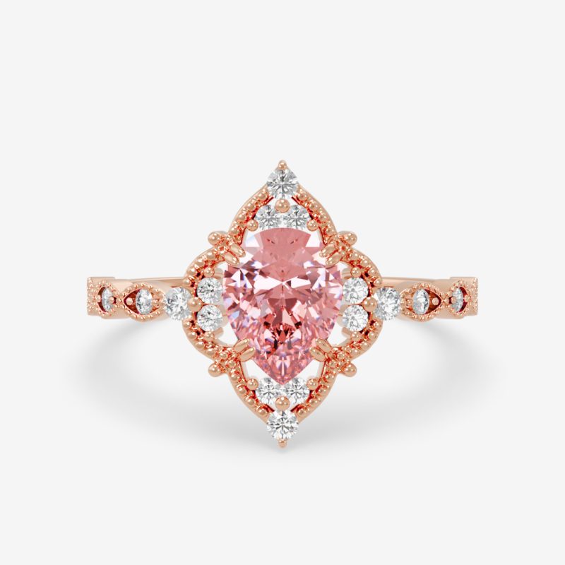 The Margaret engagement ring is a graceful blend of vintage charm and romantic elegance. Its pear-cut pink center stone glows warmly, embraced by a detailed diamond halo that enhances its brilliance. The ornate band, adorned with sparkling side diamonds, evokes timeless sophistication. Designed for those who cherish both classic beauty and meaningful symbolism, Margaret is a ring that celebrates love in its most radiant form.
