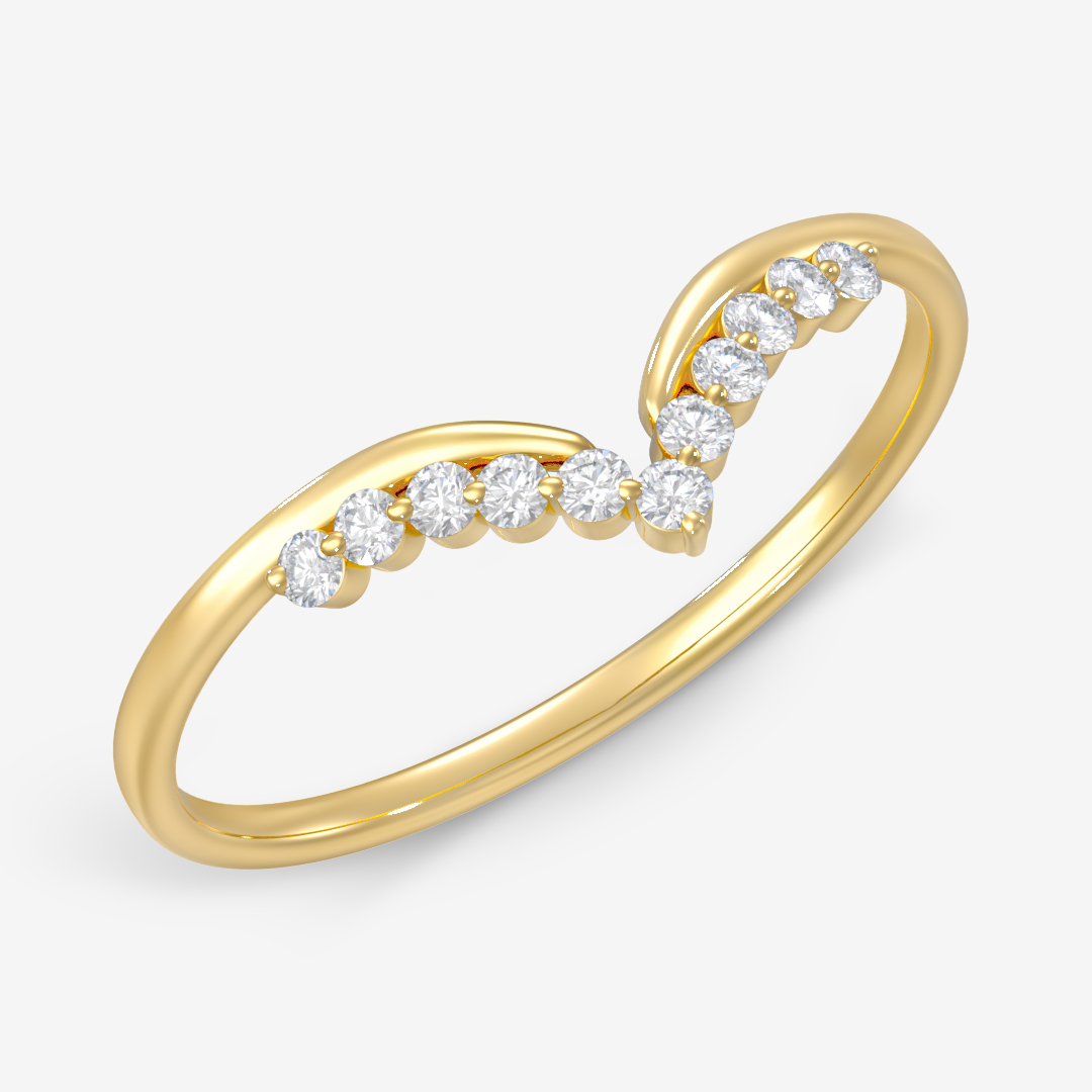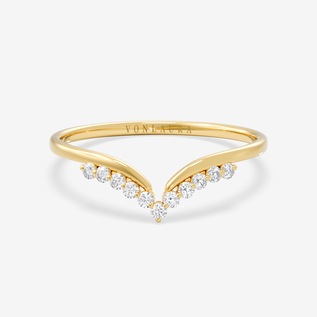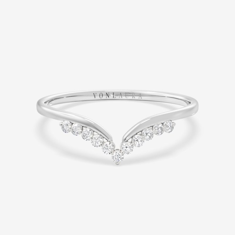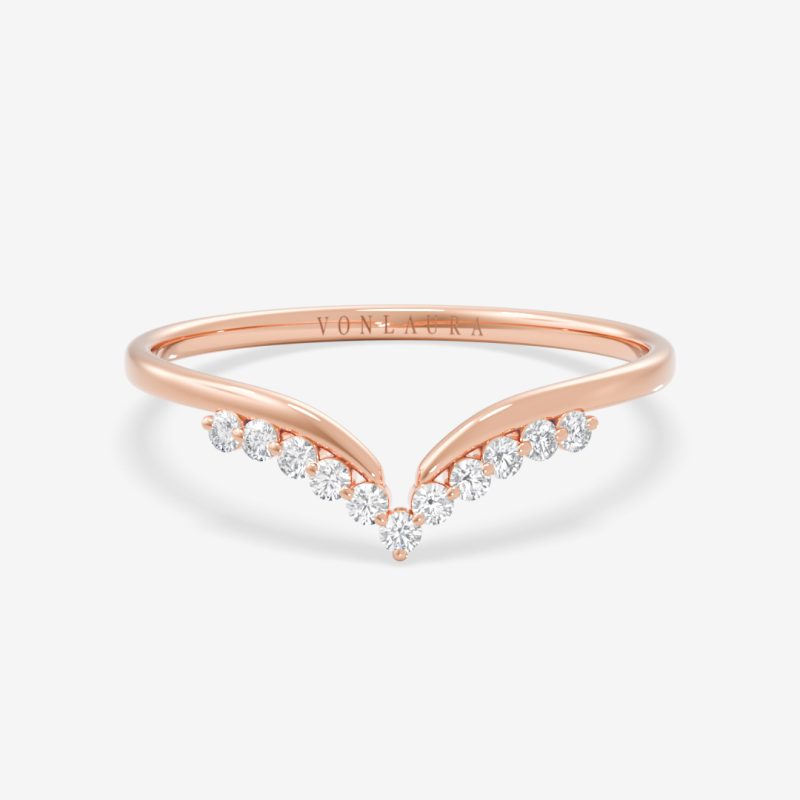 Rosalind is a gracefully curved diamond band designed to complement engagement rings with elegance and perfect symmetry. The V-shaped contour is adorned with shimmering diamonds that create a refined, delicate sparkle.