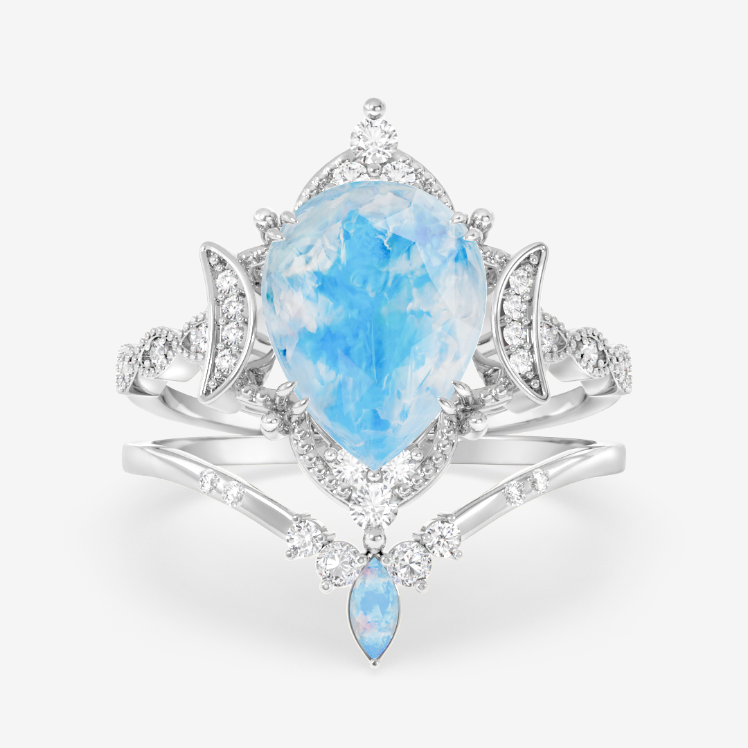 Selene is an enchanting set of engagement and wedding rings, crafted to reflect the magic of moonlight. The pear-shaped blue moonstone shimmers with an inner glow reminiscent of the night sky, embraced by diamonds and crescent-inspired details. Together with the matching wedding band, it forms a union that feels as dreamlike as it is powerful.