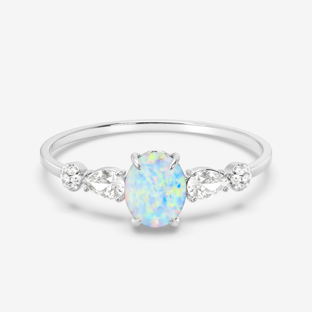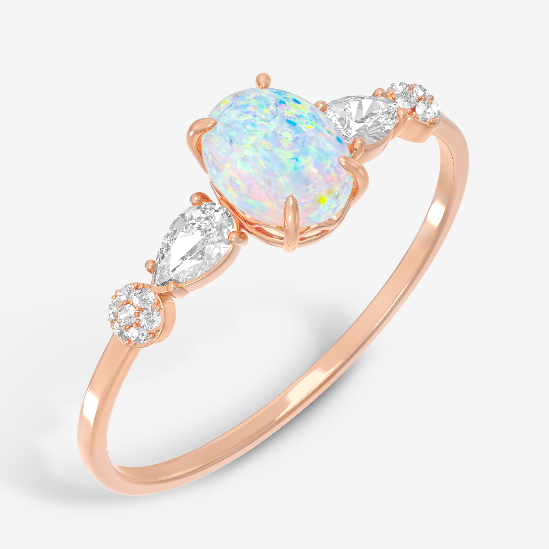 Selina is an engagement ring that glows with ethereal beauty. At its heart rests a luminous opal, shimmering with shifting hues of light and color. Framed by hand-set natural diamonds in a delicate arrangement, the design evokes the image of raindrops glistening on petals after a summer storm.