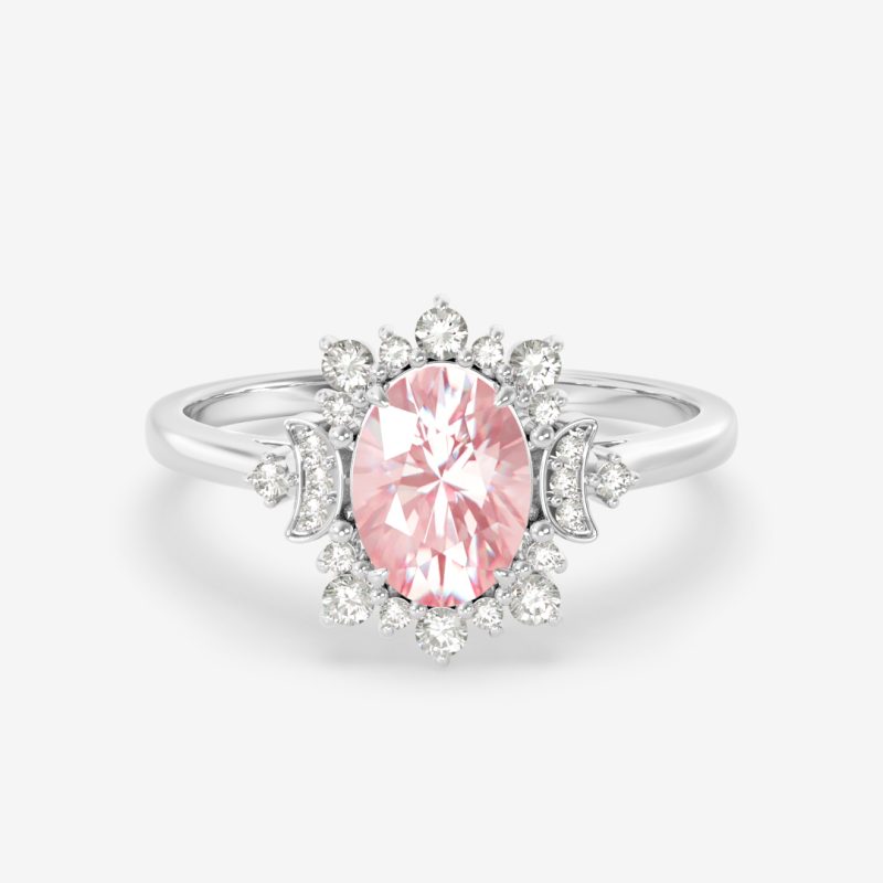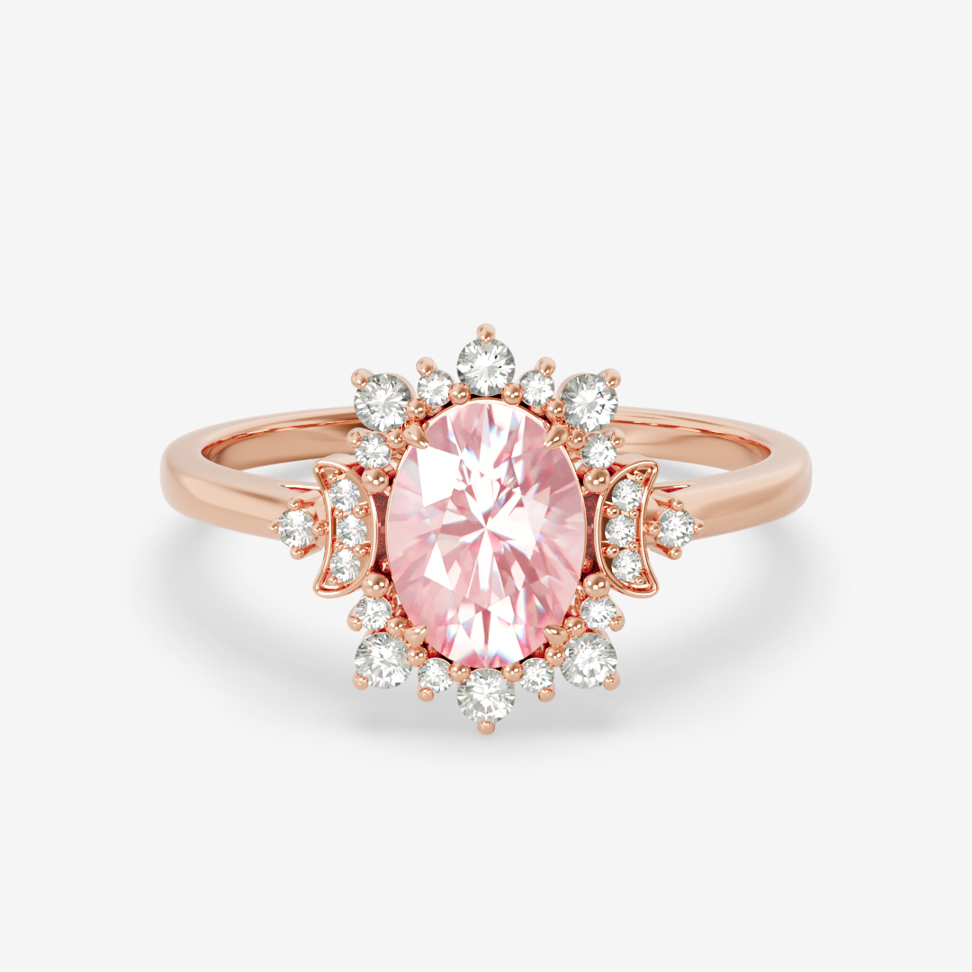 Victoria is an engagement ring designed to embody romance and celestial beauty. Its centerpiece, an oval-cut pink gemstone, radiates with soft warmth and elegance. Surrounded by a luminous halo of diamonds and accented by delicate crescent motifs, the design feels like a crown of light resting upon the finger.